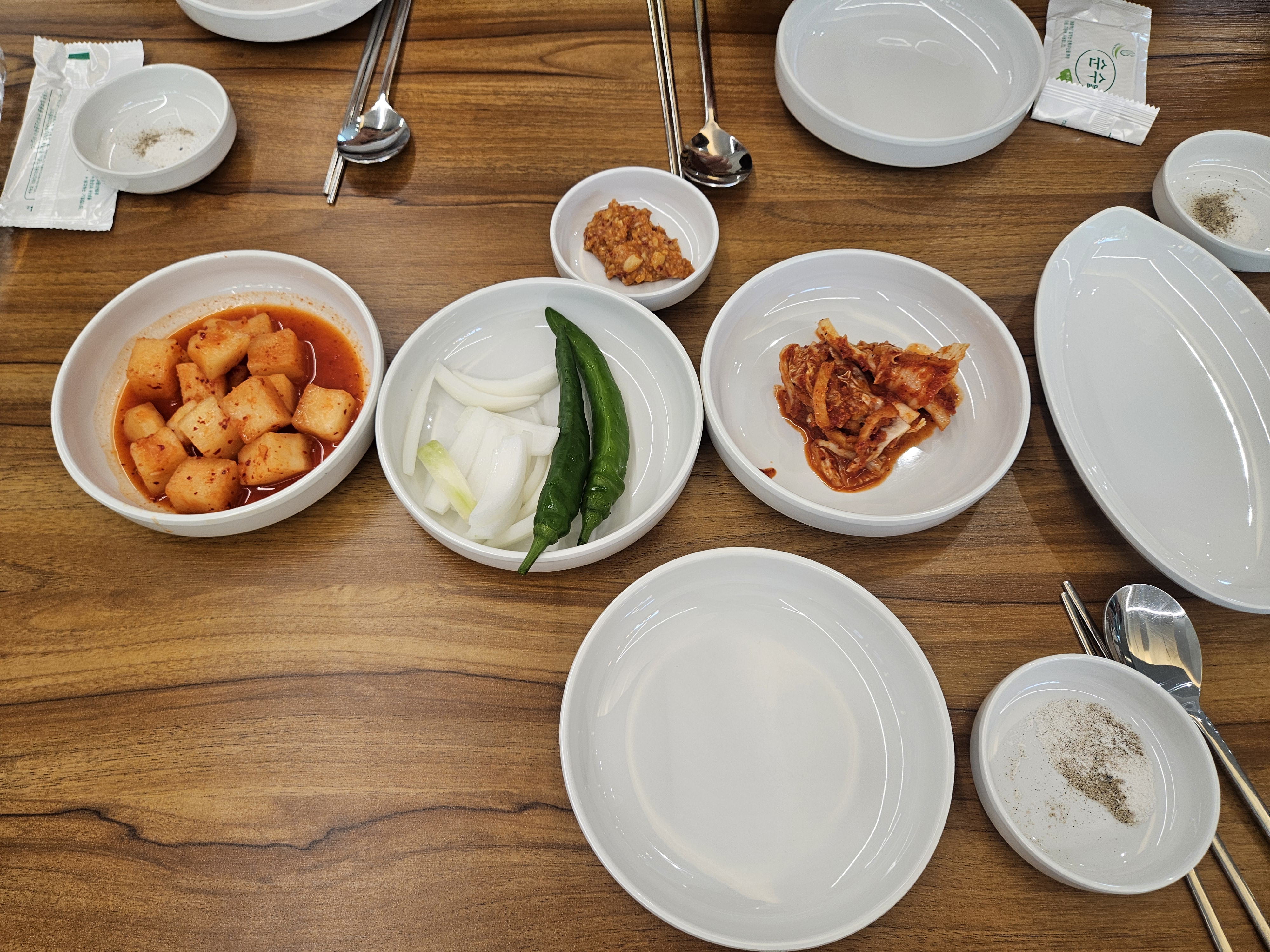 반찬은 김치, 깍두기, 양파와 고추 깔끔하게 나왔어요.